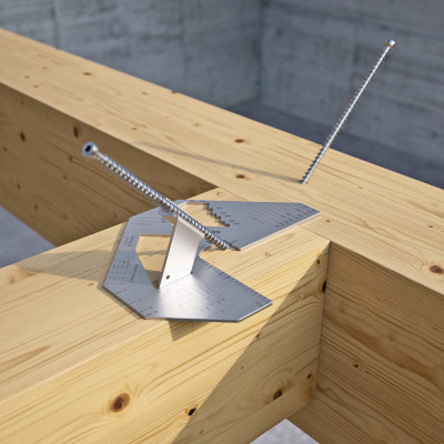 In acciaio inossidabile di spessore 3 mm, garantisce durabilità e può essere utilizzata per realizzare giunzioni legno-legno a 45° di travi e solai su legno massiccio, X-LAM e LVL, ed è lo strumento più indicato per operare con connettori CTC legno-calcestruzzo.
